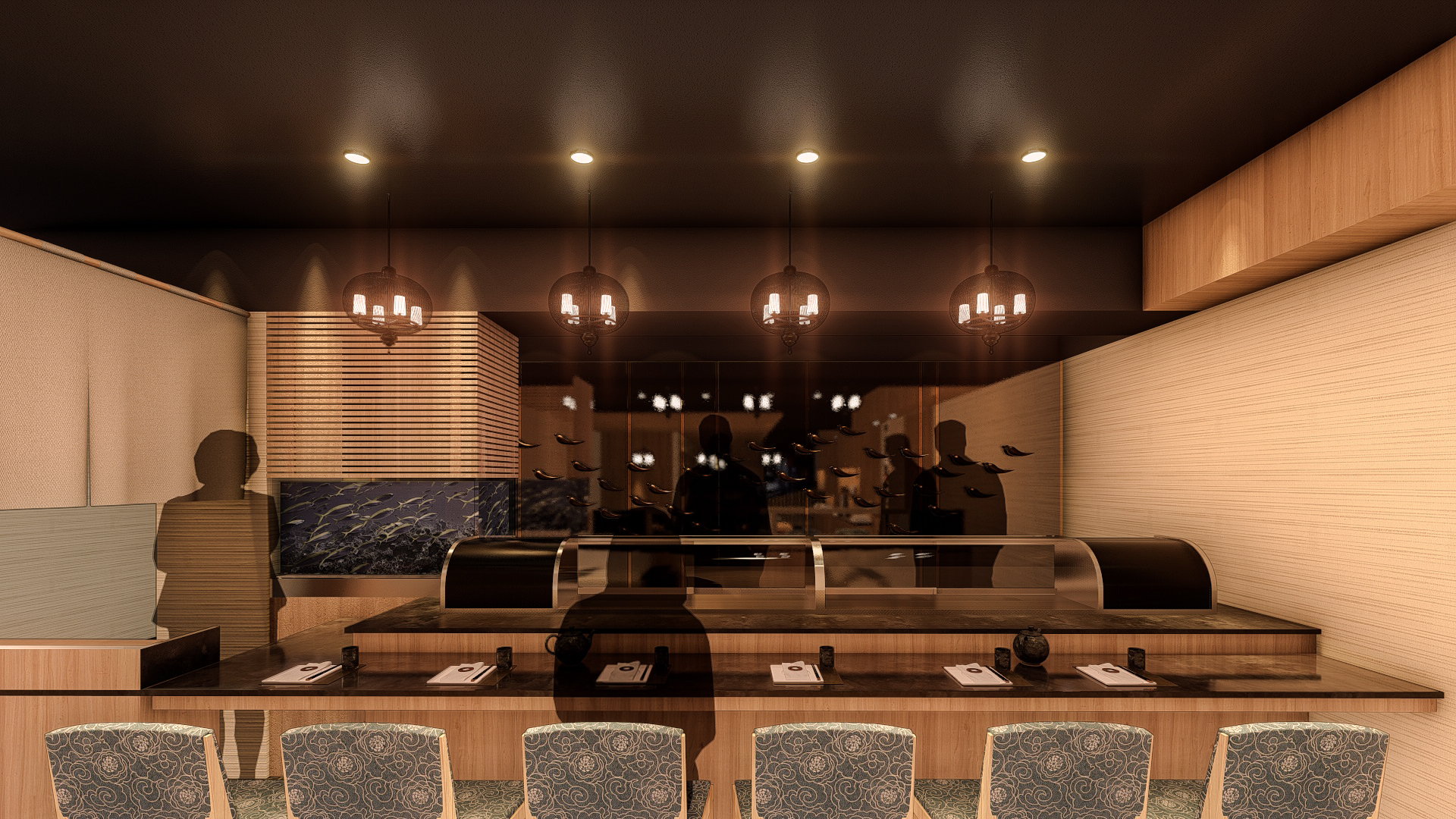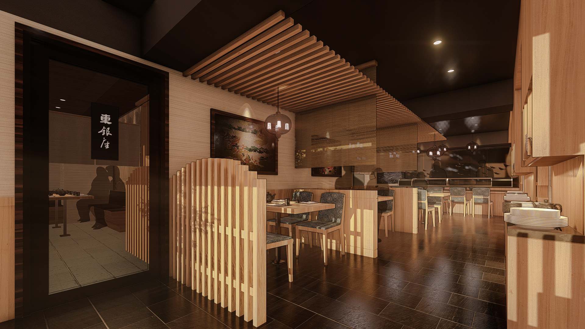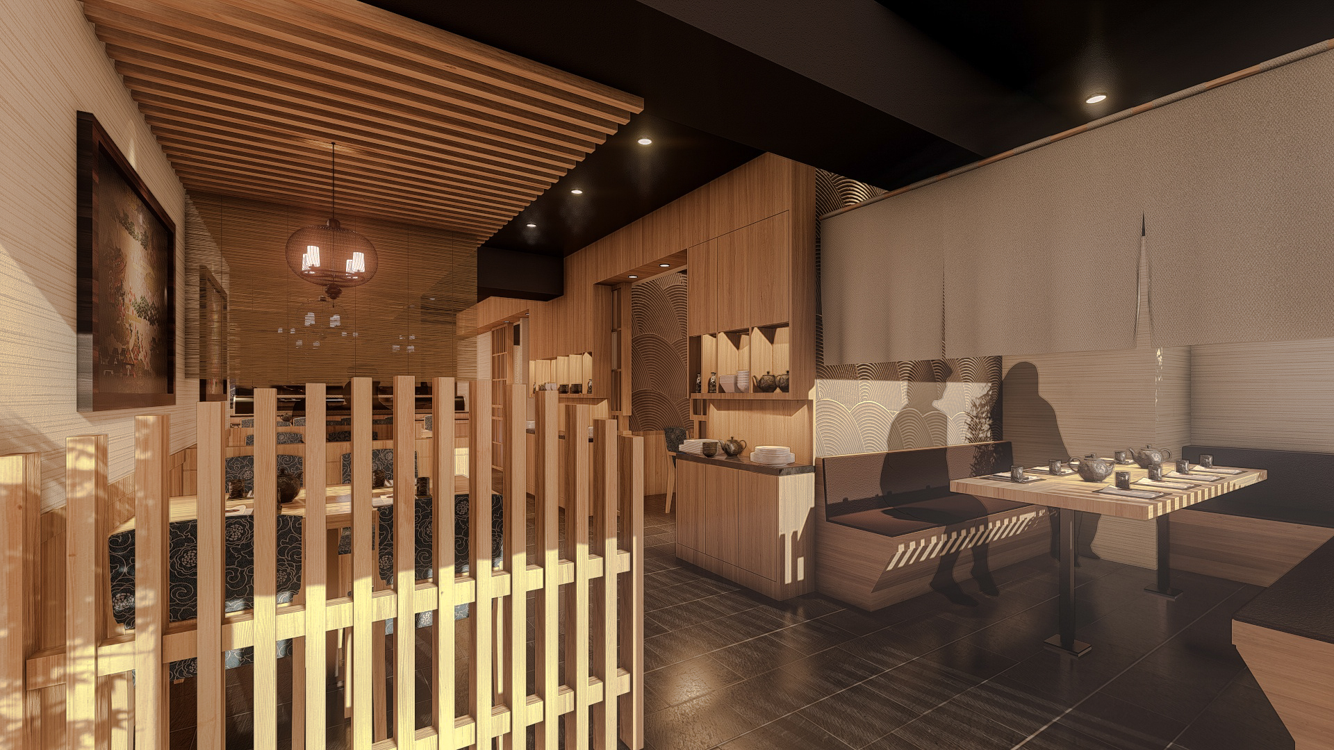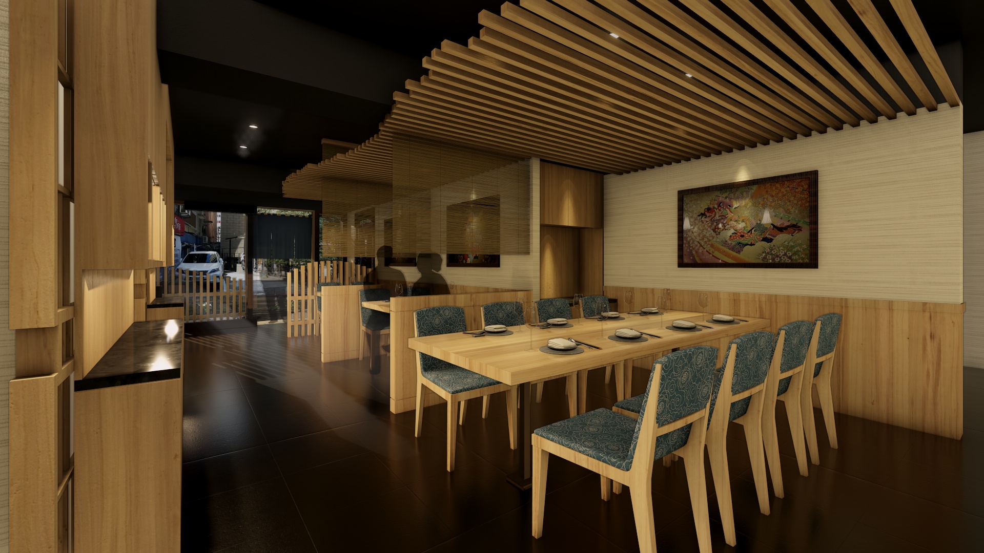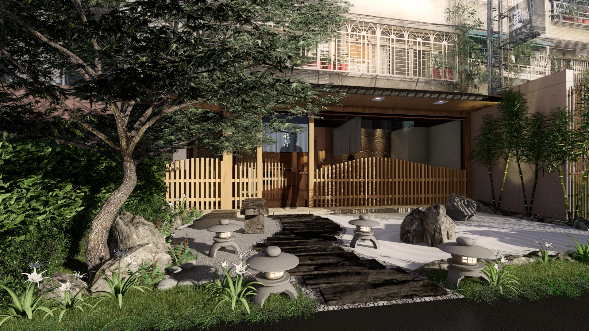 本案我們運用3D透示圖給業主評估參考。在模擬的3D圖中,日式庭園的大門入口,步道旁放置石燈籠,再以一個大型特色石頭作為視覺主軸,並搭配竹子、松柏等植栽,讓客戶一進來就明顯感受到日式氛圍,餐廳內部則大量使用日式元素,包含飾品、餐具、壁布、傢具等,以日式花紋、畫作、擺飾等,如同在日本境內餐廳,讓室內設計為精緻美食加分。