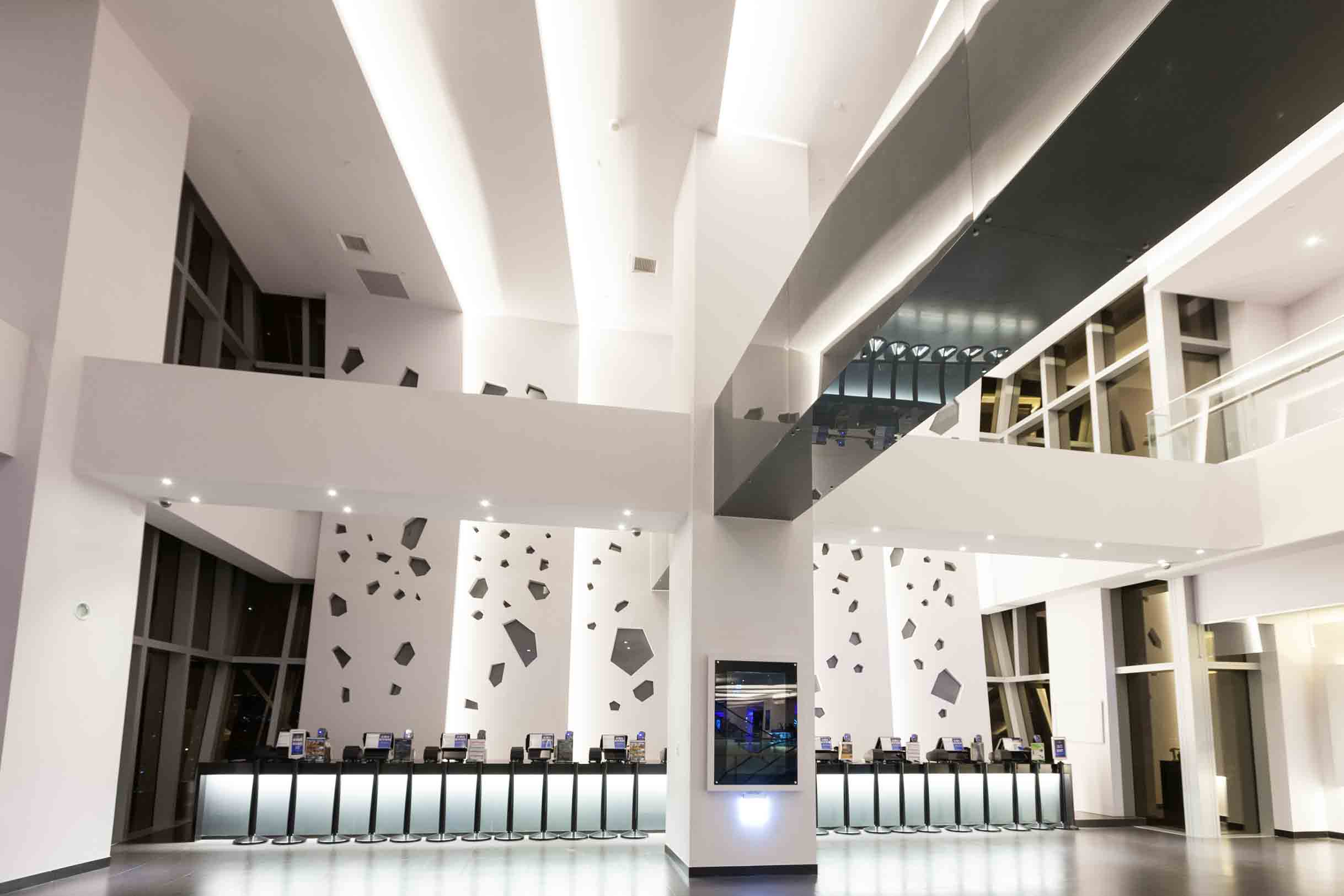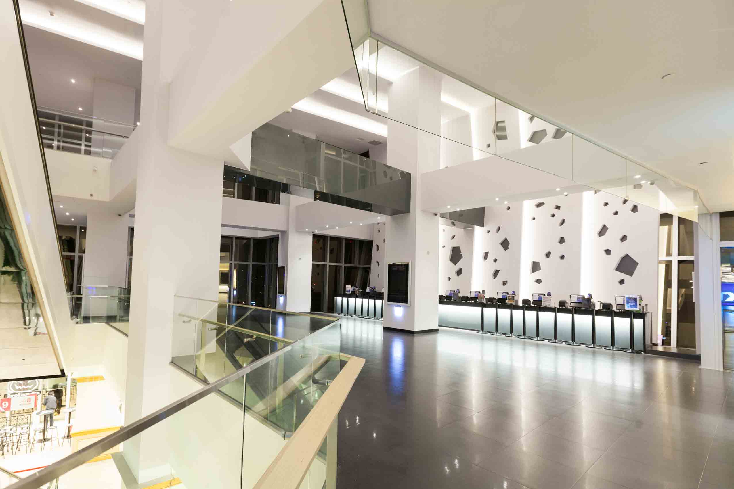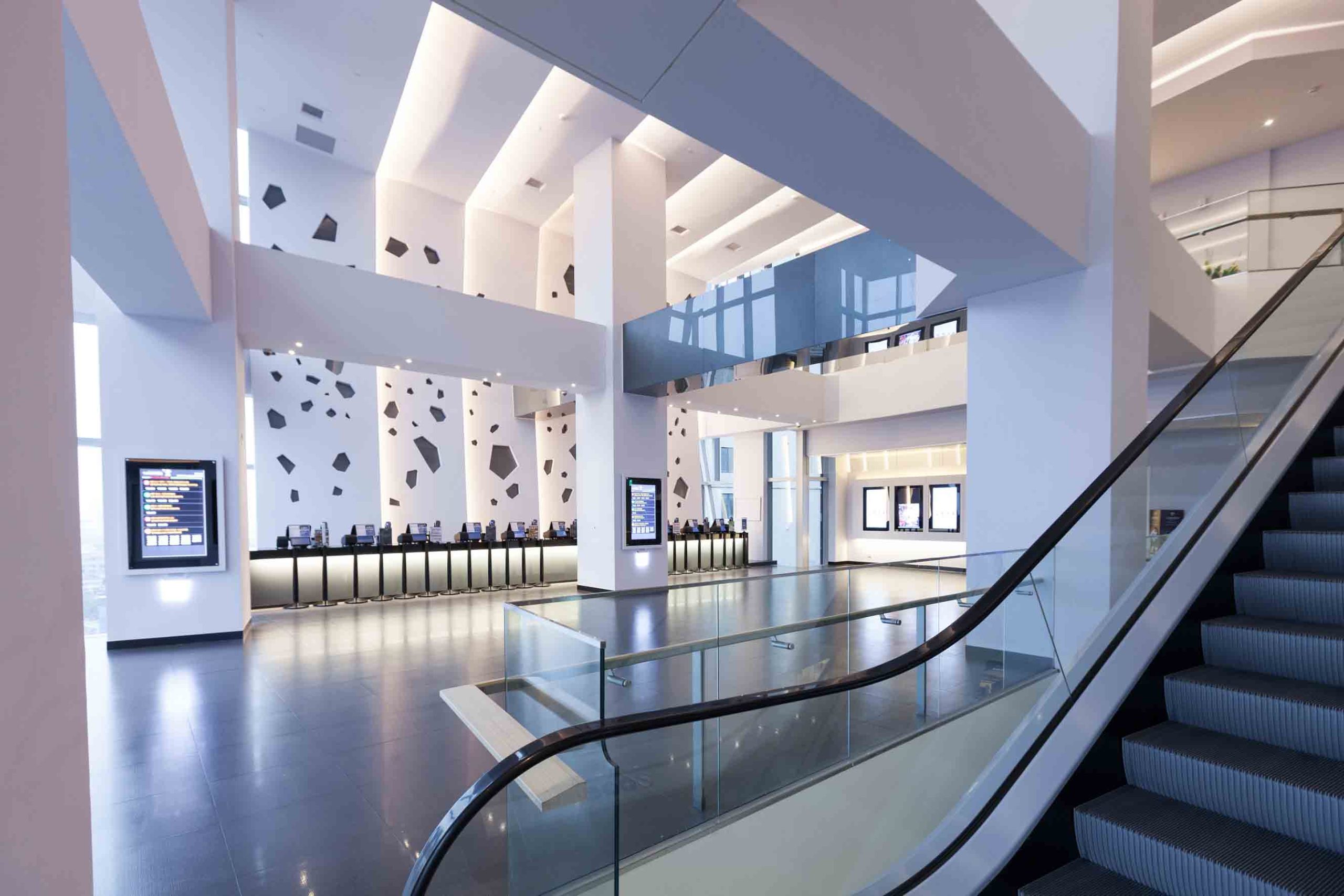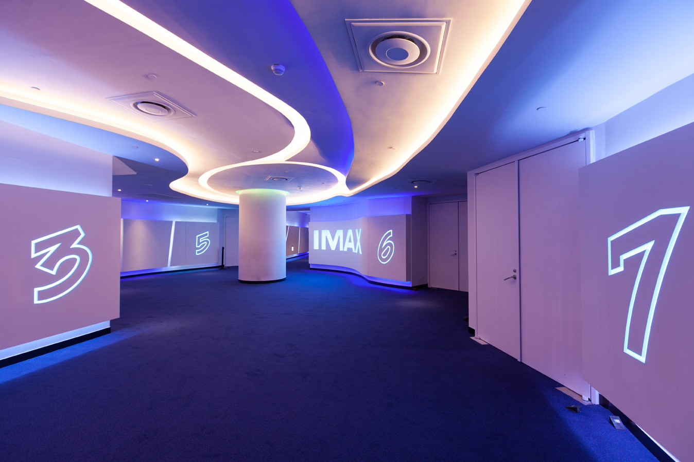 板橋遠百威秀影城在構思初期,最吸引我注意的是它位處五鐵共構的交通樞紐位置。有感於現代人忙碌的生活步調,我期待這件作品能讓消費者在這兩到三個小時的觀影時刻裡,忘卻平日庸碌,在一個奇幻的未來空間內,充分享受休閒娛樂時光。我試圖以速度感的動態曲線,勾勒出超現實的空間,並統合藍色的燈光,完整地創作出宛如虛擬次元的影城特色。燈光設計考量節能因素,引進商場自然採光。而行走動線上注重視覺感的流動性,無形中帶領觀眾進入虛幻的科技世界。