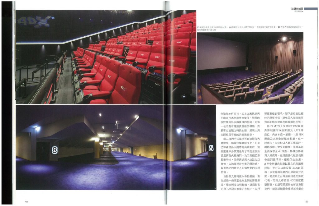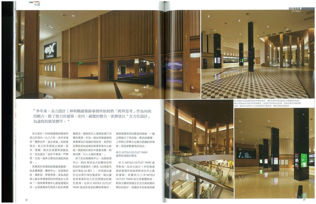感謝 台灣室內設計雜誌 Taiwan Interior Design長達八頁的報導~我們很榮幸能為 Mitsui Outlet Park 林口 裡的林口Mitsui Outlet Park威秀影城與 誠品書店林口店進行室內設計,成果也相當令我們滿意!