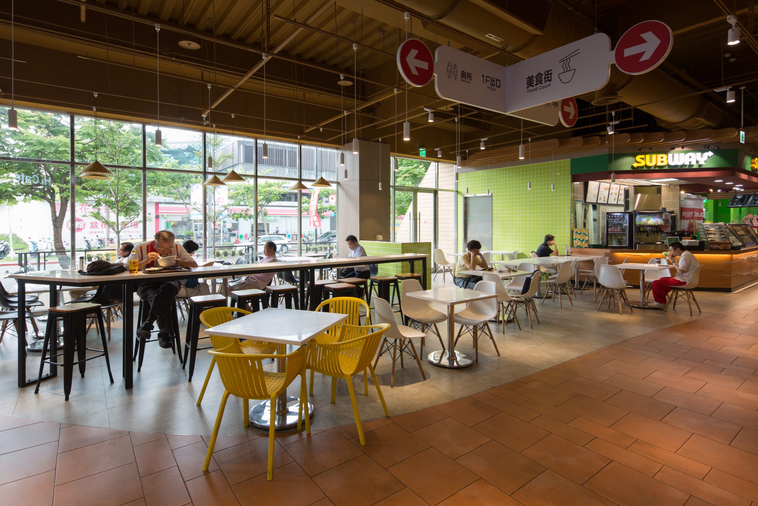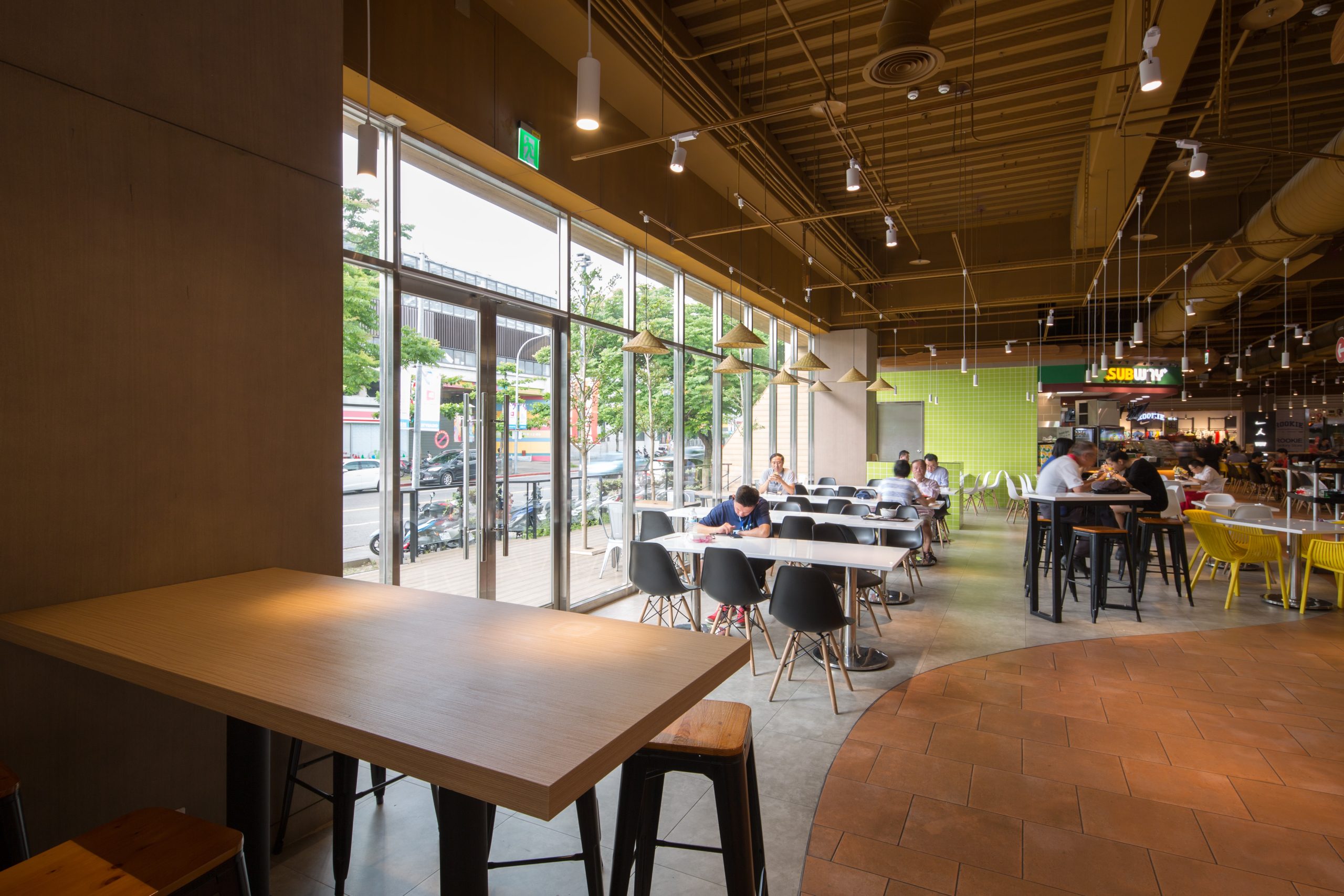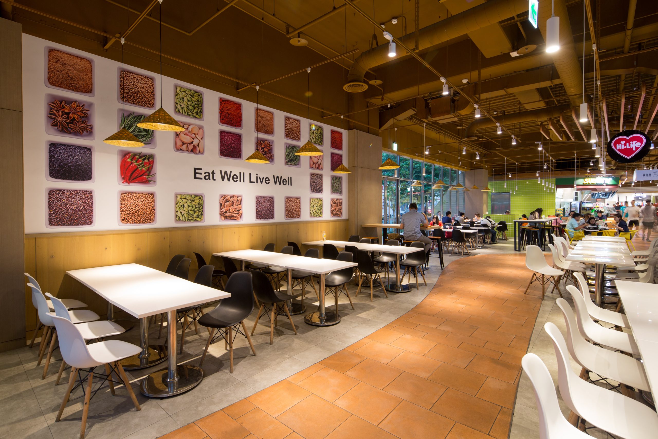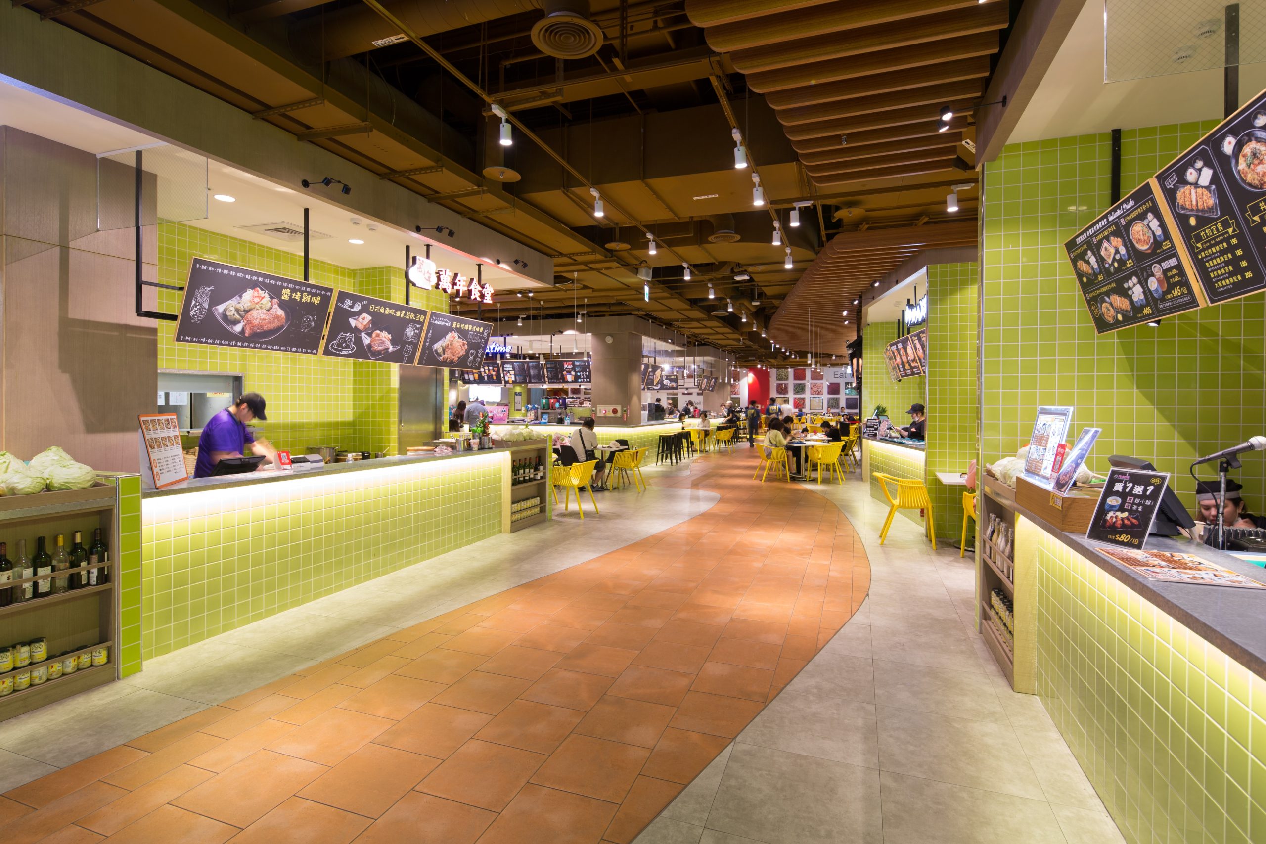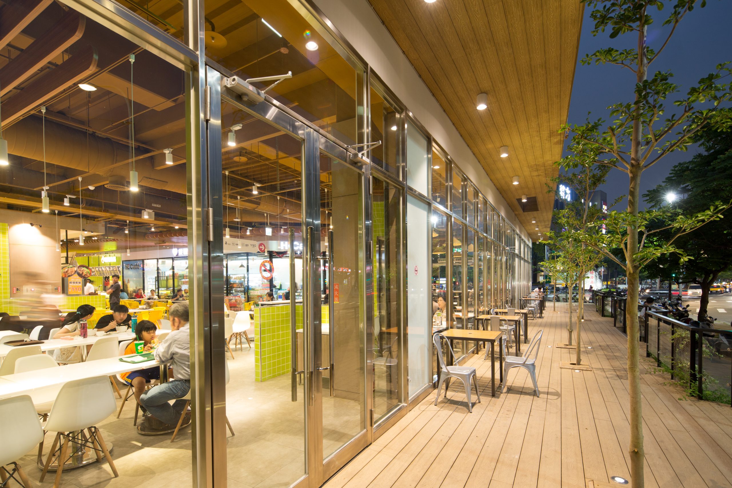 樂食匯La Place設計以歐洲市集概念發想,過去賣場美食街客席大多集中於一處,造成人潮過於集中,用餐品質環境較差,經過設計之後,動線以紅磚來呈現歐洲人行步道意象,消費者在此步道有如遊逛在市集道路中,可能下一秒看到令客人驚喜的異國美食,增加如同逛街找美食的趣味性。而客席分散不同區域,街景區、戶外區、兒童遊戲區、聚會區、沿街座位區、小廣場區、立食區等,能降低人潮擁擠感覺,提高用餐環境品質。